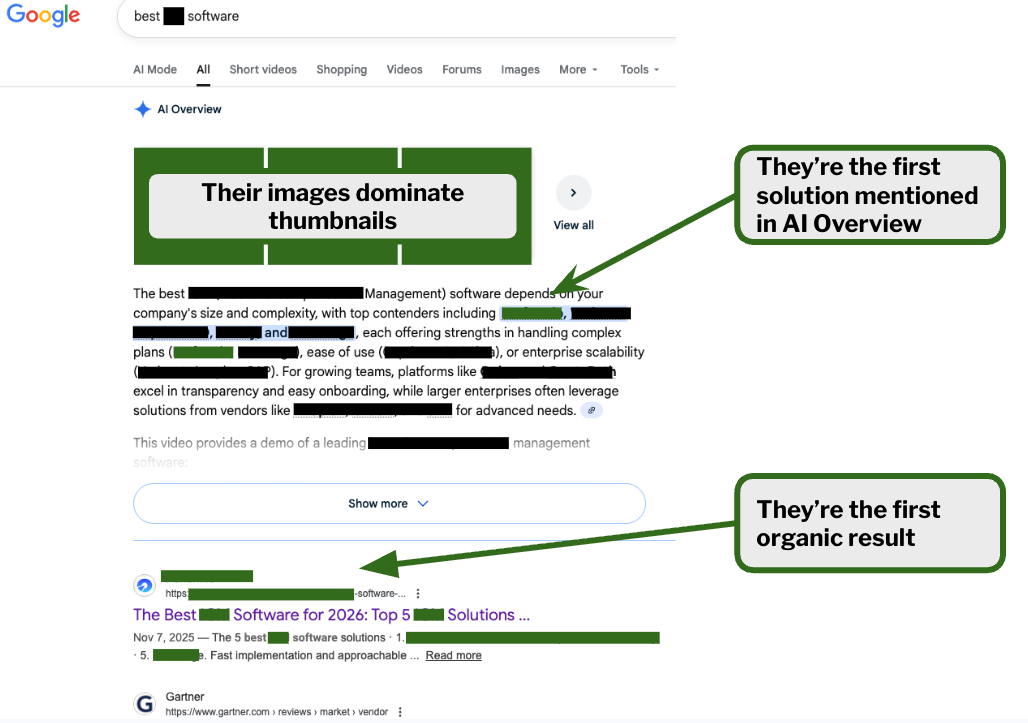 Today, if you Google the “best software” in their category, they not only rank #1 in organic results, but they’re consistently in the first three solutions mentioned in Google’s AI Overviews … and often, they’re mentioned first: