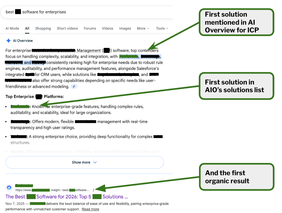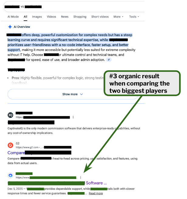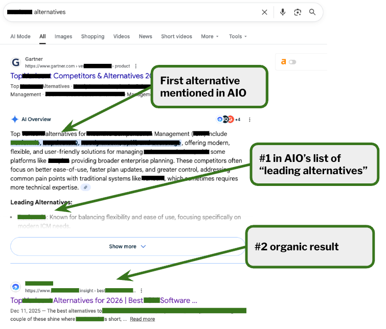 … and they’re in both the top organic results and the AIOs when people search for alternatives to their main competitor: