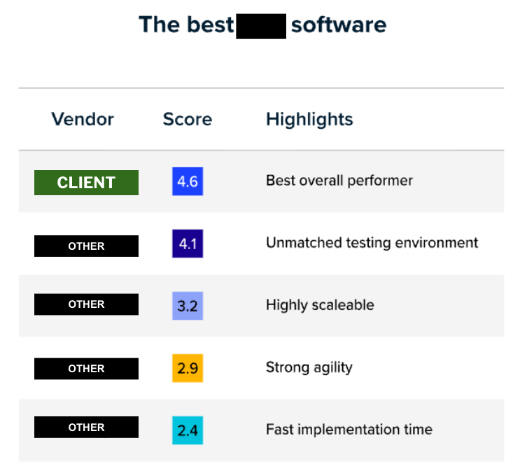 The BOSS method addresses this problem directly. Your writers, sales folks, event speakers, and execs can point to the scores you’ve published and say, “This is why we’re the best,” or better yet, “Here’s why we’re the best in the areas that really matter.” Once that argument has been made, you can beat that drum over and over again.